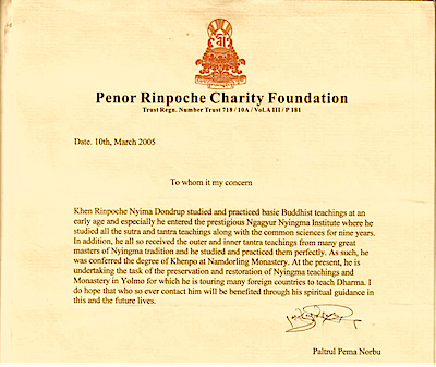This society was created by Khen Rinpoche Nyima Dondrup in 2010, to provide teaching of the Buddha-Dharma. It is registered for this purpose in full accordance with Nepalese government regulations.